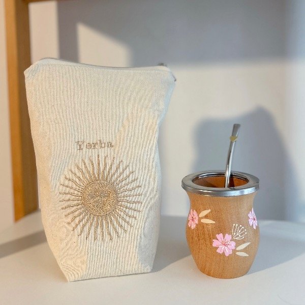 Mate de madera de caldén pintado a mano con virola de acero inoxidable.