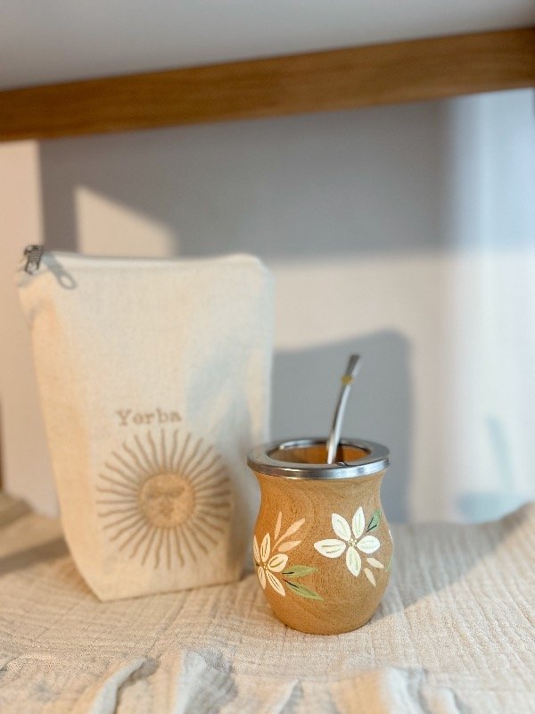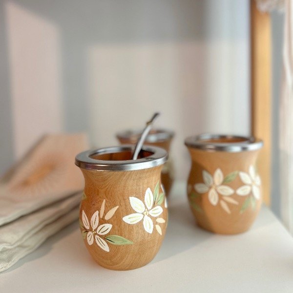 Mate de madera de caldén pintado a mano con virola de acero inoxidable.