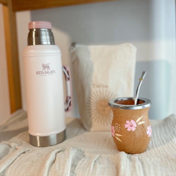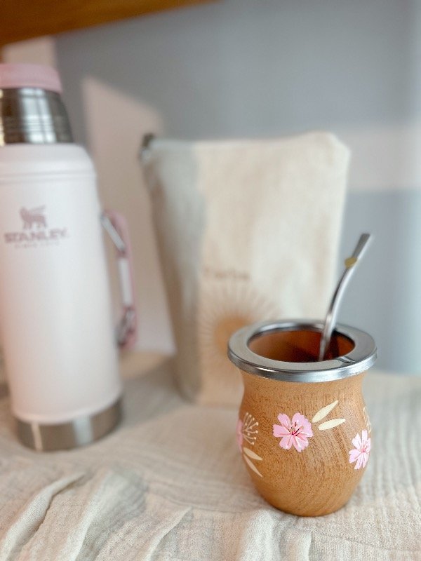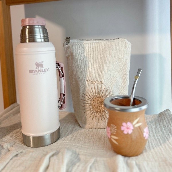 Incluye mate de calden diseño Capri + Termo Stanley Rose Quartz + Yerbera bordada Sol + Bombilla pico de loro + Stickers de regalo.